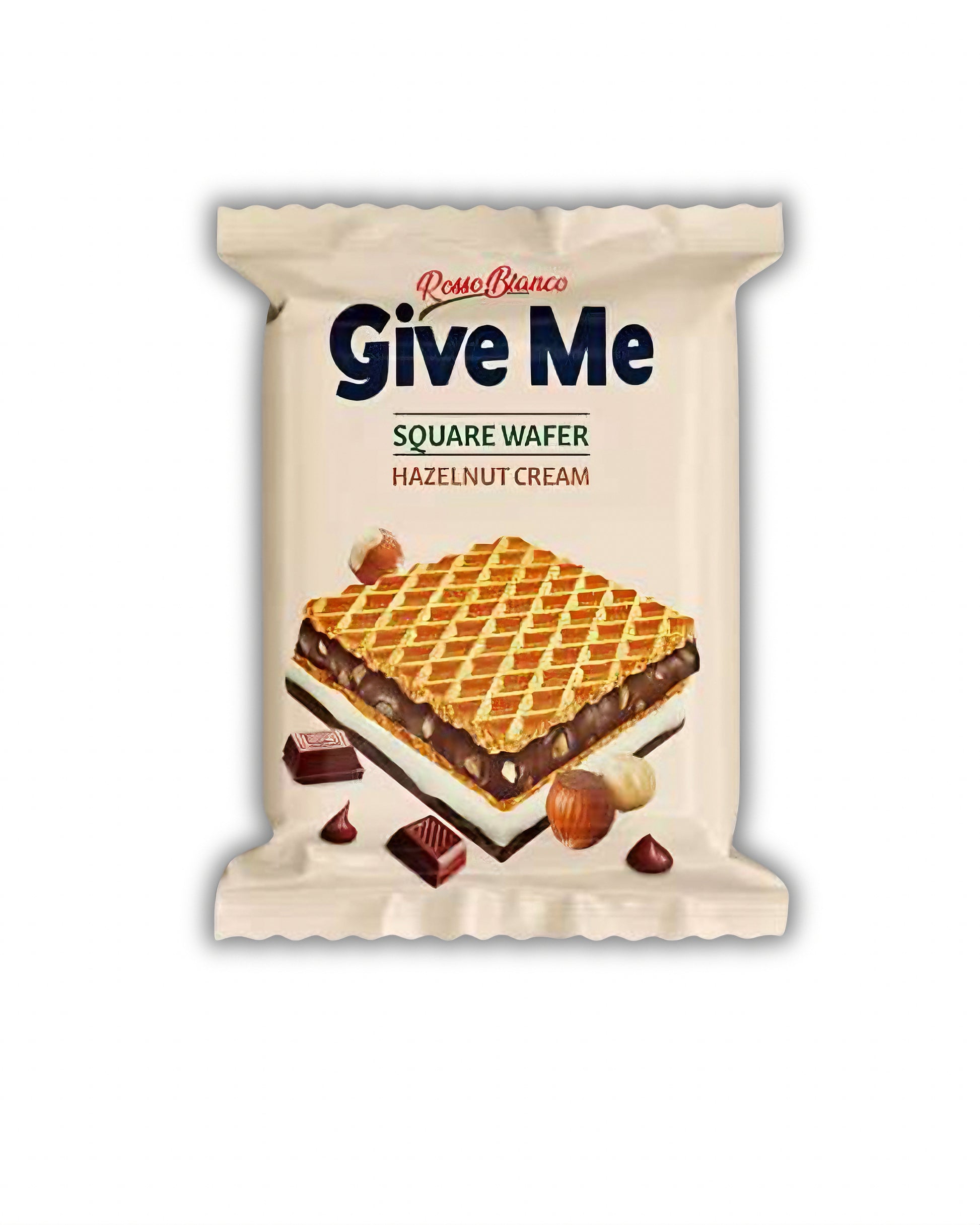 Rosso Bianco Give Me Square Hazelnut Cream to połączenie delikatnie chrupiącego wafla z bogatym, kremowym nadzieniem orzechowym, które rozpływa się w ustach, uwalniając pełnię orzechowego smaku. Intensywny krem laskowy, otulony mleczną czekoladą, idealnie współgra z waflem, tworząc wyjątkową kompozycję, która oczaruje każdego miłośnika słodkości.